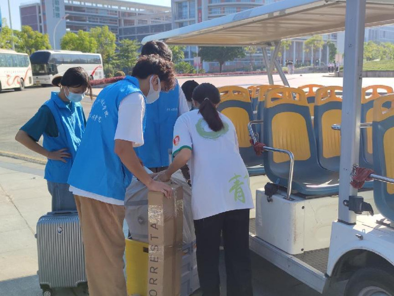 志愿者现场搬运行李 期间学校党委副书记、纪委书记夏韩辉,党委委员、副校长唐毓秋,学校办公室主任吴浩,学生处处长刘建军,学生处副处长郭朝明等分别前来指导工作,慰问迎新工作人员,了解报到进展,为广大新生开启崭新的大学生活送上美好祝愿和殷切期望。校领导们对各项迎新工作表示充分肯定,鼓励工作人员再接再厉,以饱满的精神状态迎接新同学,让来自祖国各地的每位新生都能感受到学校的热情与关怀。
