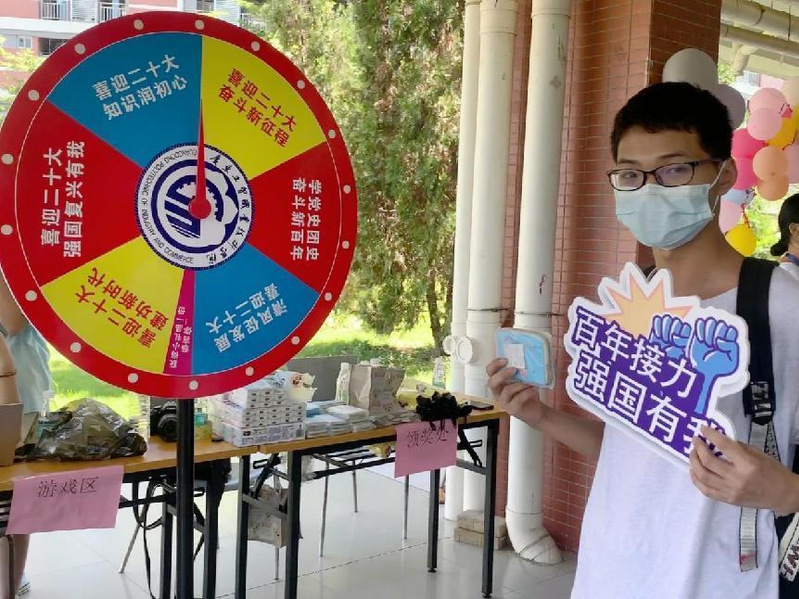 学校领导到现场指导工作 百年恰芳华,世纪正青春。2022年是中国共青团建团100周年;同时也是中国共产党二十大召开之年。为营造浓郁的迎新氛围,汽车工程学院以“喜迎二十大,永远跟党走,奋进新征程”为主题,在迎新工作中融入党史答题游戏。游戏设置为转转盘模式,学生通过转转盘随机转到一个板块并由工作人员随机抽取题目进行回答,依据答对题目数量领取奖品,让新生在享受游戏乐趣的同时也收获满满的党史知识;通过活动引导汽车工程学院青年学子“学史明理、学史增信、学史崇德、学史力行”;更好地用党的百年奋斗重大成就和历史经验增长智慧、增进团结、增加信心、增强斗志、牢固党性意识,传承红色基因。
