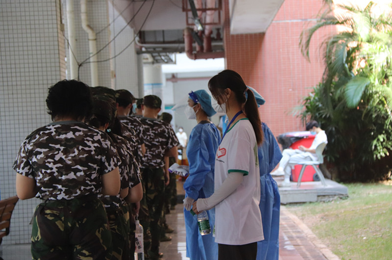志愿者服务现场 在检测现场,志愿者们早早来到岗位上,穿上防护服,做好自我防护,并按照部署分组进行核酸检测引导、查看粤康码、信息录入、秩序维护等工作。核酸检测工作以10人为一组,同学们有序排队,自觉佩戴口罩,间隔出1米以上的安全距离,拿着提前准备好的“二维码”有序地进行扫码登记。