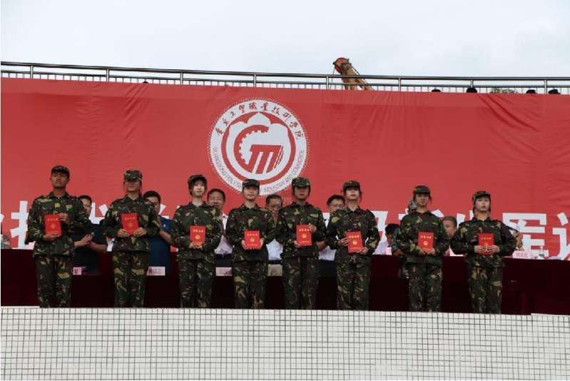军训汇报表演 莘莘学子,百炼成钢。十四天的军训,工贸学子实现了意志品质的跨越与蜕变,他们刻苦训练,奋勇争先。为表彰先进,树立先进典型,凝聚榜样力量,学校对军训期间表现优异的集体和教官进行了一一表彰,希望大家秉持“掉皮掉肉不掉队,流血流汗不流泪”的信念,在日后的学习生活中积极进取、顽强拼搏。同时为感谢白云区武装部在军训期间对我校的新生谆谆教诲,特制作一面锦旗赠予他们。
