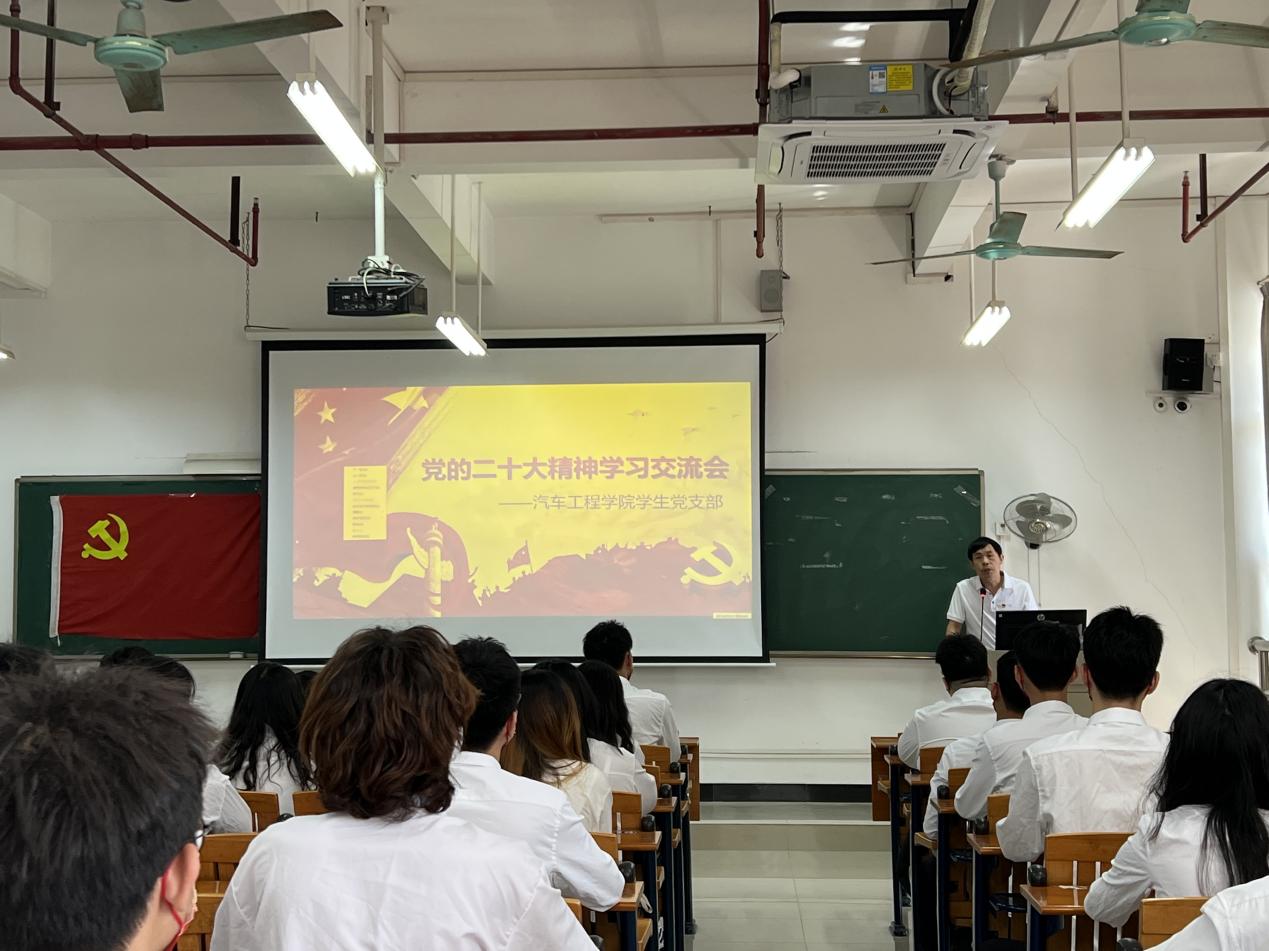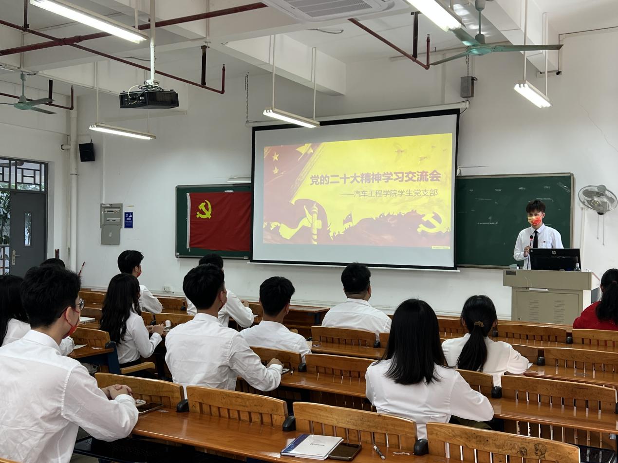 为庆祝党的二十大胜利召开,深入学习党的二十大精神,提高同志们的党性修养,10月16日上午10点,汽车工程学院学生党支部在明德楼2区202教室开展党的二十大精神学习交流会。此次会议由学生党支部书记刘彩云主持,学院党总支书记彭卫东莅临指导,支部全体在校党员参与。