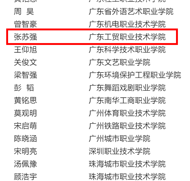 获奖名单公示 张苏强,男,汉族,汽车工程学院2019级电子信息工程技术专业学生。他身残志坚,曾担任汽车工程学院主持队队长、辩论协会辩论队队长、班级组织委员。他认真学习专业知识,以勤奋刻苦、锲而不舍的精神努力扩大知识面,同时在课外参加技能竞赛及创新创业竞赛,不断地充实自我、提升自我,时刻都展现出了自己自强不息、阳光向上的生活态度,还曾获第十六届“挑战杯”广东大学生课外学术科技作品竞赛特等奖、第七届中国“互联网+”大学生创新创业大赛广东省决赛银奖等荣誉。