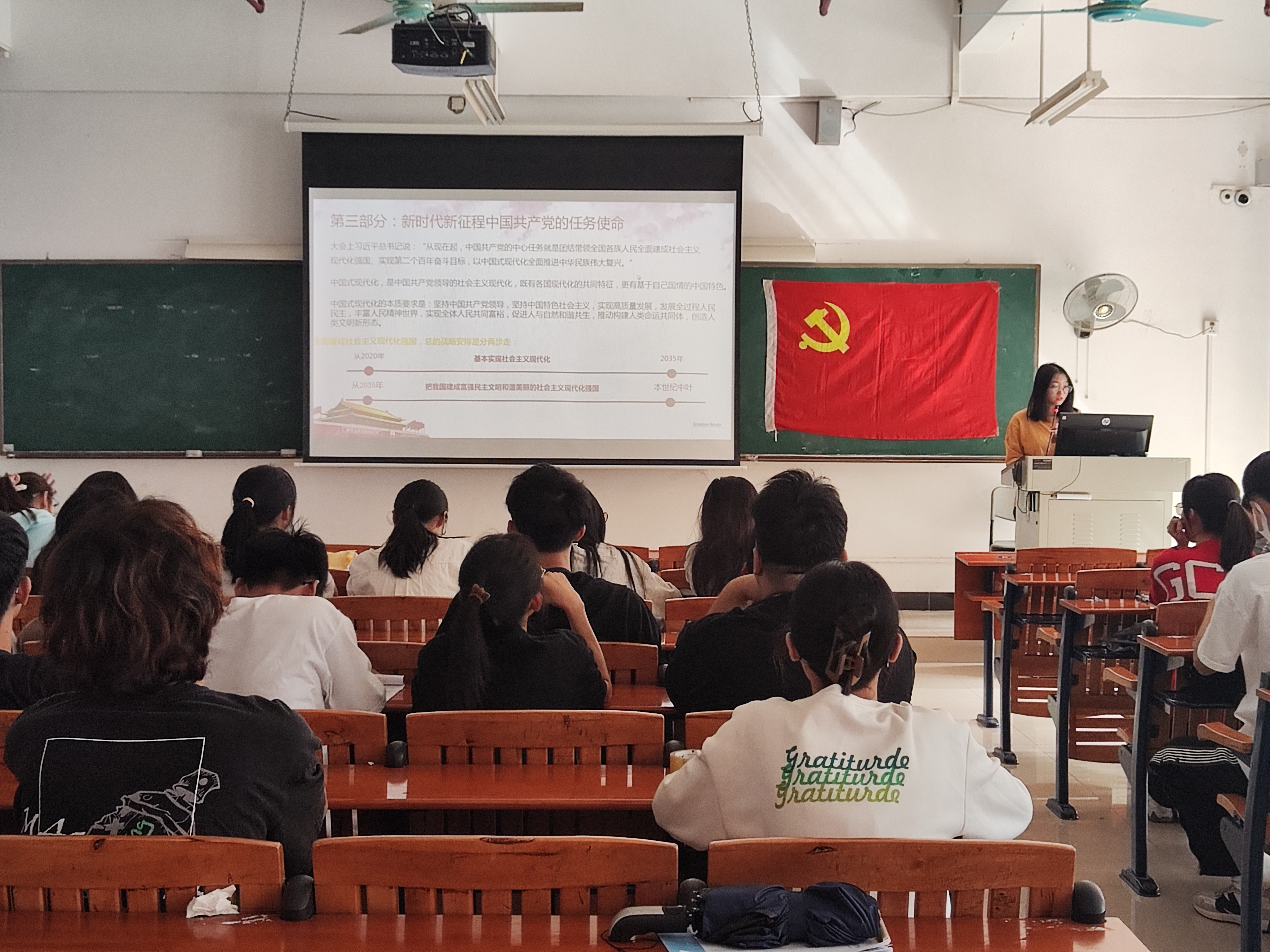 分享环节 在学习分享环节上,党章小组部和组织部和我们分享学习心得,我们要通过学习党的二十大精神,党的伟大精神力量,奋进新征程。我们要用理想之光照亮奋斗之路,用信仰之力开创美好未来,补足精神之钙、把牢青春航线。我们要进一步感悟思想伟力、真理力量,提高思想自觉,涵养“砍头不要紧,只要主义直”的政治信仰。 志愿者部跟我们分享了党史故事,一个舍命坚守小高岭阵地的高地雄魂——杨根思。青山处处埋忠骨,何须马革裹尸还。杨根思和战友们用宝贵的生命大挫美军的士气,他们的精神早已超越了战火烽烟,我们需要学习传承杨根思的耿耿丹心精神,让它在时代的征途中永远璀璨发光。宣传部则给大家分享了燃灯老师——张桂梅。张桂梅作为党的二十大代表之一,含泪听完报告,她讲到,只要我能够在一天,我就决心为党育人、为国育才。此种无私奉献,坚守初心、对党忠诚的崇高品格和至诚情怀值得我们学习。