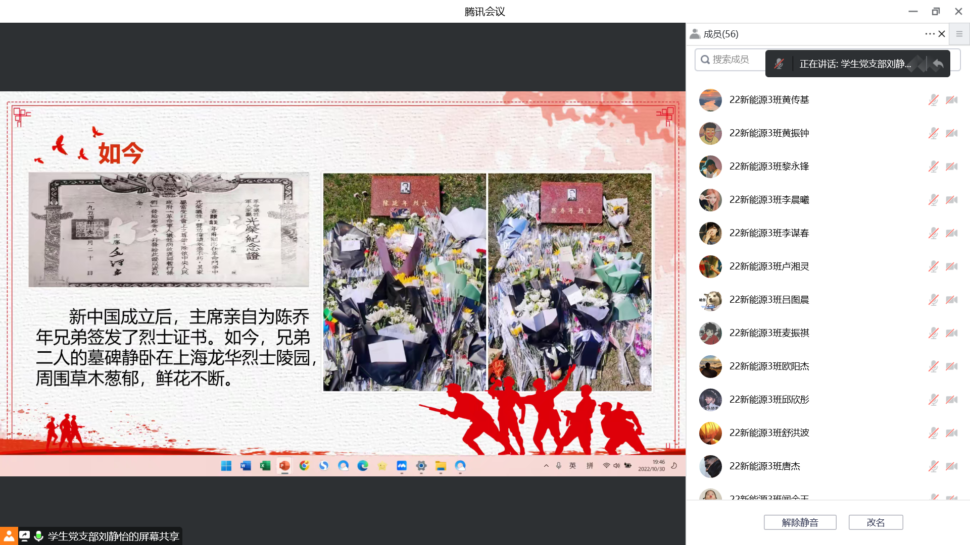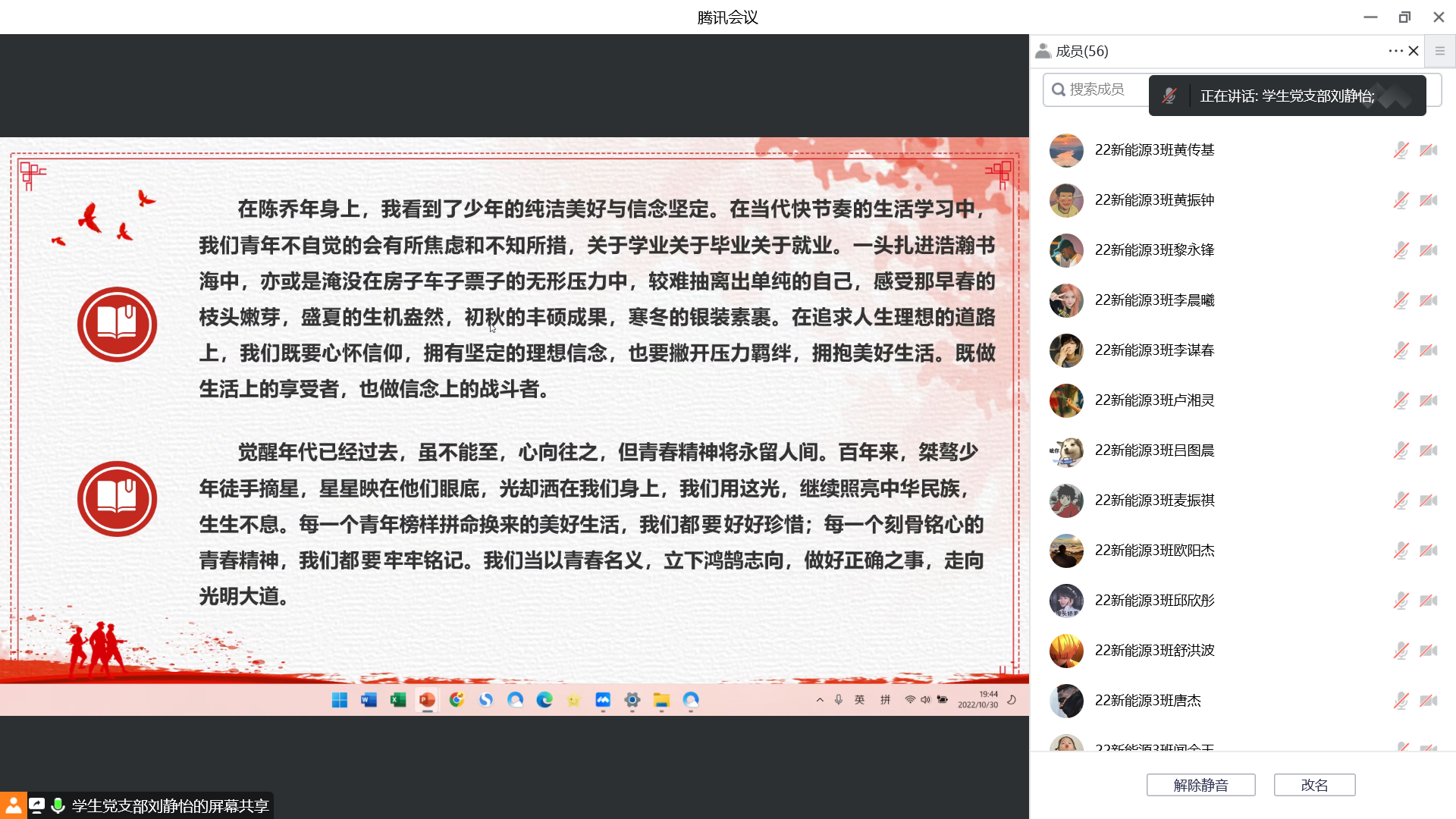 为庆祝党的二十大胜利召开,进一步推动党史教育深化人心,激发青年学生的爱党、爱国热情,引导广大青年学生学党史、知党恩、跟党走,10月30日上午10点,菲律宾亚星222官网“学生党史宣讲团”成员刘静怡向汽车工程学院22新能源3班开展线上党史宣讲活动。