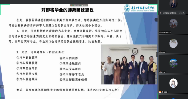招聘会现场 大会伊始,由汽车工程学院党总支副书记欧敏宣布本次线上招聘会正式开始,会上各家企业向毕业生介绍公司的就业岗位、工资待遇等详细信息。同时,同学们都仔细地转听企业的讲解,分析企业的岗位与自身条件的适配度。指导老师们也耐心解答学生们的各种问题,并强调大学招聘会是学生最方便的一条渠道,当前疫情形势十分严峻,就业竞争激烈,叮嘱学生多投递简历获取就业机会。