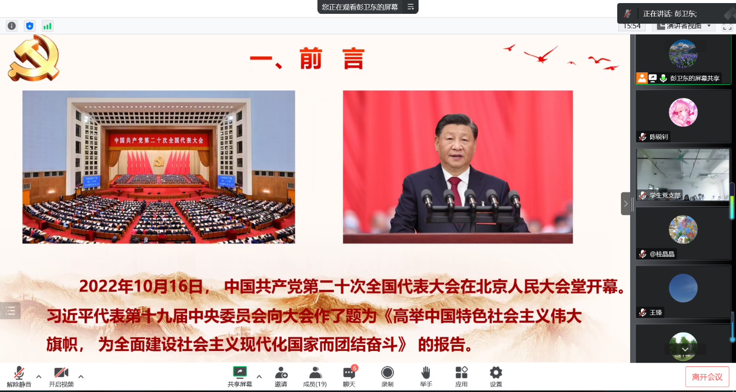 网络会议现场 接着,杜汉清围绕着“大会主题”、“新时代十年的伟大变革”以及“推进文化自信自强”、“五个必由之路”等23个关键方面进行了解读,并结合学校实际对全体师生党员提出了学习党的二十大精神的具体要求。他指出,作为新时代的知识分子,我们要深入学习领会党的二十大精神,要带着问题学、带着感情学、带着责任学,把坚定正确的政治方向体现在学懂、弄通、做实习近平新时代中国特色社会主义思想上;要围绕党的二十大部署和党的教育方针落实立德树人的教育宗旨,为党育人、为国育才;要将党的二十大精神运用到学院的教学、科研、专业建设、文化传承和社会服务等方面,推进学校双高院校建设,用奋进之笔,谱写工贸汽车学院新篇章。 白云校区会议现场 (汽车工程学院 文/图 陈锐钊 编辑/陈锐钊 审核/彭卫东) |