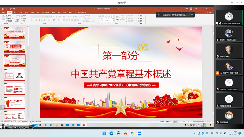 为深入学习贯彻党的二十大精神,共同学习党的二十大报告和党章,3月10日晚上19点,汽车工程学院学生党支部开展线上学习党的二十大报告和党章专题学习会,支部书记刘彩云和全体学生党员参加此次学习。 会议伊始,我们共同学习了党的二十大报告内容,即坚定不移全面从严治党,深入推进新时代党的建设新的伟大工程。全面建设社会主义现代化国家、全面推进中华民族伟大复兴,关键在党。我们党作为世界上最大的马克思主义执政党,要始终赢得人民拥护、巩固长期执政地位,必须时刻保持解决大党独有难题的清醒和坚定。作为党员的我们生逢其时,实现梦想的前景无比光明,我们要做有理想、敢担当、能吃苦、肯奋斗的新时代好青年,我们要“以学增信”,在深入学习贯彻党的二十大精神中立根铸魂!
