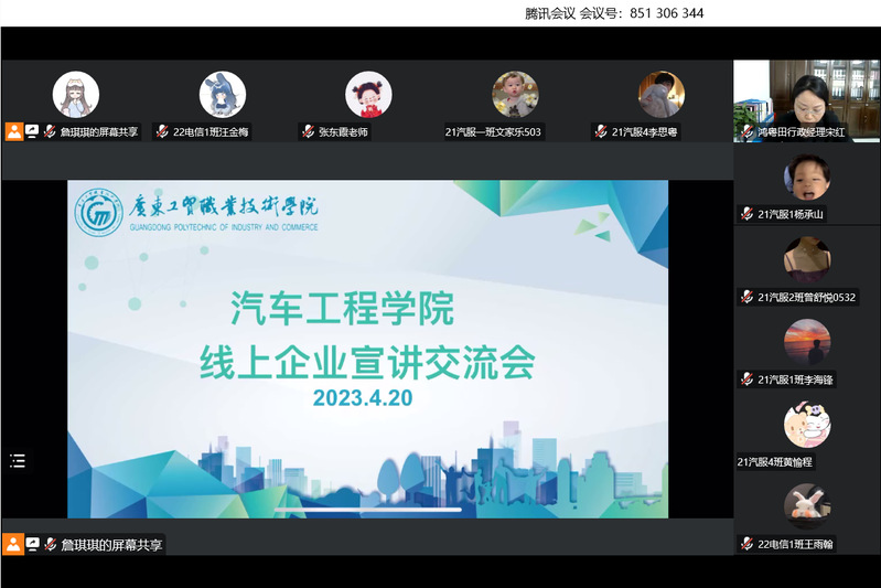 为进一步做好就业工作,向毕业生提供更加优质的择业平台,让毕业生们对用人单位的招聘需求和标准有更为深入的了解,实现学院毕业生充分、高质量就业,汽车工程学院于2023年4月20日下午2点30分召开线上企业宣讲会,此次会议由汽车工程学院辅导员詹琪琪主持,参会嘉宾有汽车工程学院张东霞老师、广州鸿粤田汽车销售服务有限公司行政经理宋红女士、广东鸿粤Jeep品牌销售服务有限公司李艳波女士、欧佳智造技术有限公司邬剑锋先生以及汽车工程学院21级毕业生。