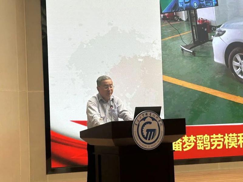省级劳模潘梦鹞教授发言 随后,潘梦鹞教授通过习近平总书记在党的十九大报告中的重要精神:“要坚持党管干部原则,坚持德才兼备、以德为先,坚持五湖四海、任人唯贤,坚持事业为上、公道正派,把好干部标准落实到实处”,从而引出职业教育要立德树人,德技并修这一观念。同时他也以电影《长津湖》中著名片段为我们诠释了使命感和责任感是我们建功立业的强大动力。 最后,潘梦鹞教授为我们详细介绍了“潘梦鹞劳模和工匠人才创新工作室”科研团队教师们的科研成果,以及他们源源不断的创新,希望在座的老师和同学们能以此为榜样,去弘扬劳模精神、劳动精神、工匠精神。