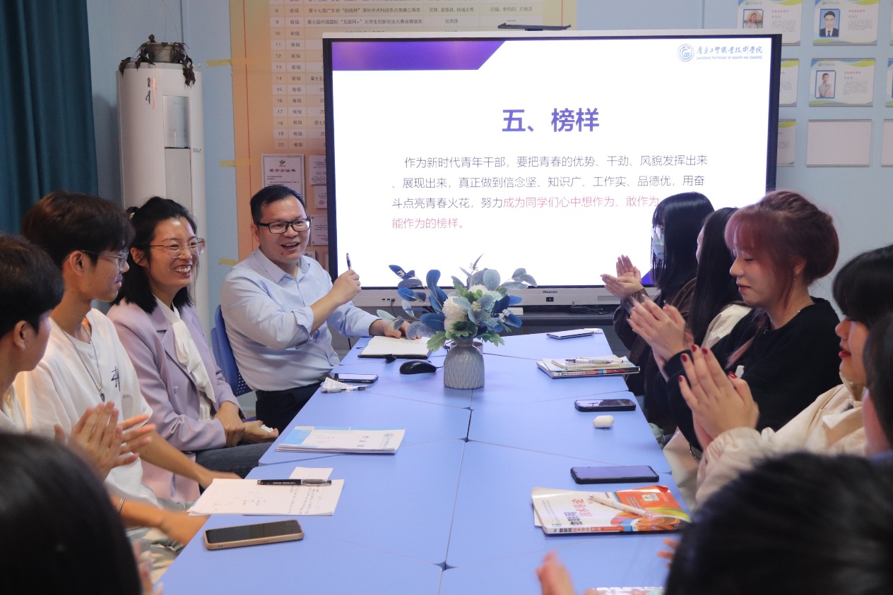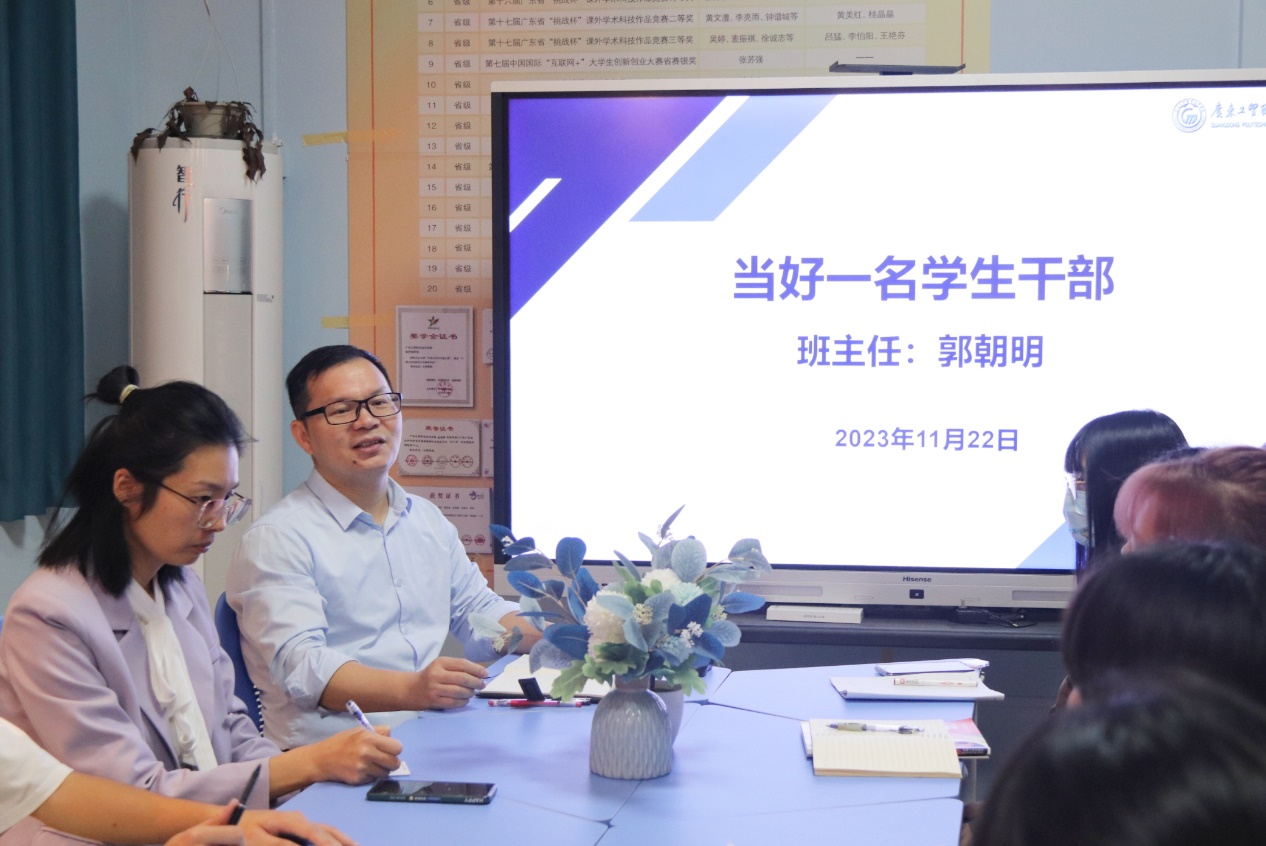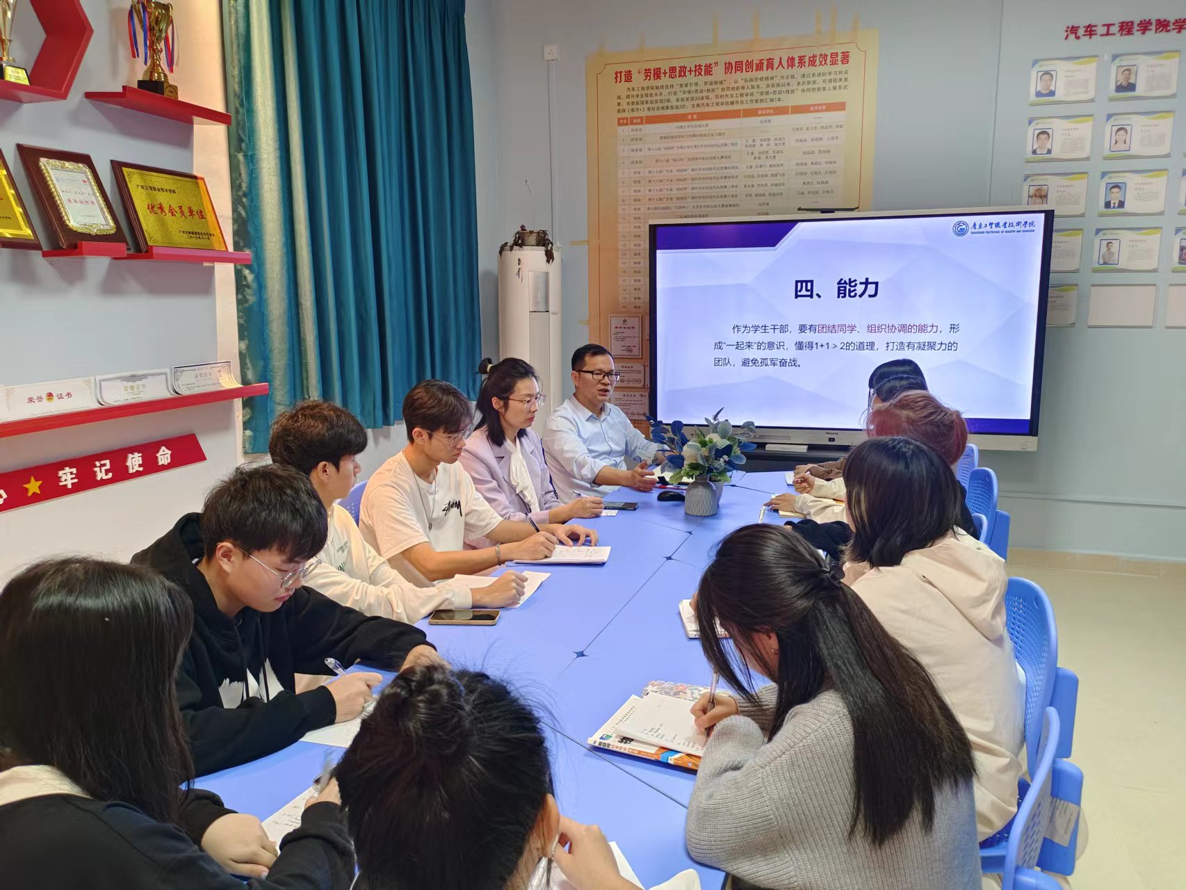 为推进学校“一站式”学生社区综合管理模式工作机制,践行“以学生为中心”的理念,给领导与学生干部提供一个交流的平台,2023年11月22日晚,学生处副处长郭朝明作为22汽电3班、22汽电4班的班主任,深入学生社区,在白云校区16栋1楼班主任工作室与全体班委开展以“当好一名学生干部”为主题的座谈会,会议由汽车工程学院辅导员桂晶晶主持。
