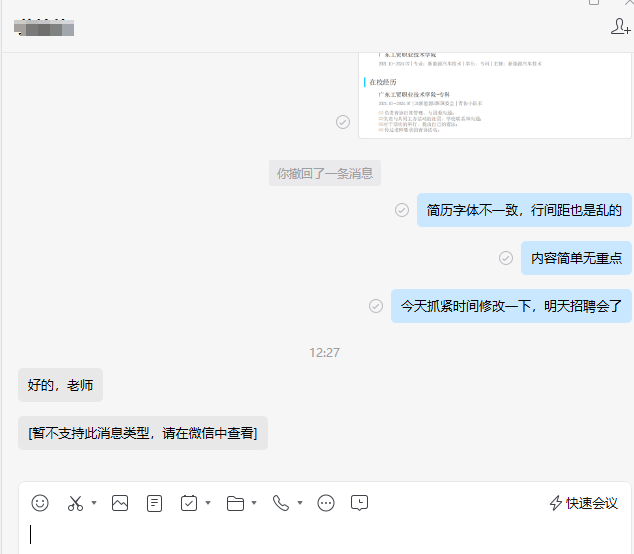 各位辅导员采取多种方式为学生提供简历修改指导,如现场一对一指导、线上“简历门诊”会议、简历修改班会等。在简历指导过程中,辅导员老师们耐心、细心,精准解决每一位学生职业定位、简历制作、求职面试过程中遇到的问题学生专心、称心,认真听指导、积极互动反馈,师生合力解决学生的求职难题。