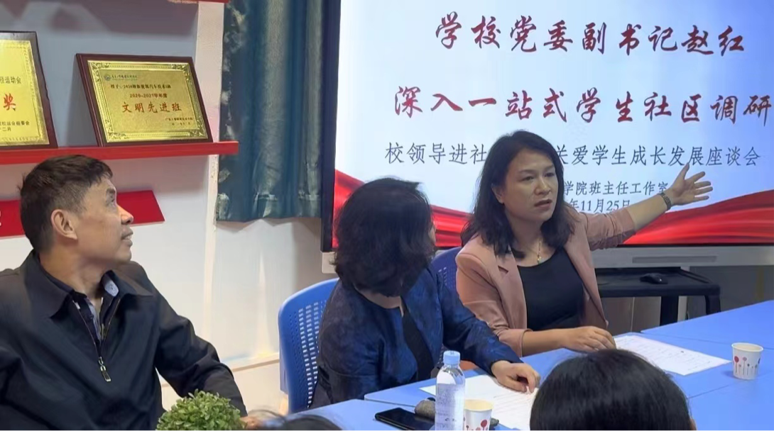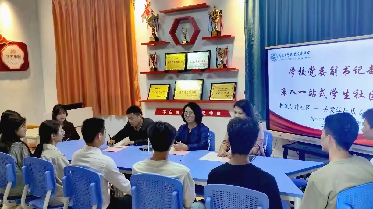 为推进学校“一站式”学生社区综合管理模式建设走深走实,践行“以学生为中心”的教育理念,充分发挥各支队伍的作用,建立健全的多部门联动机制,促使校院领导力量下沉学生社区,汽车工程学院于2023年11月25日在白云校区16栋1楼班主任工作室开展了关爱学生成长发展座谈会。学校党委副书记赵红、汽车工程学院党总支书记彭卫东、党总支副书记欧敏出席本次座谈会。座谈会由欧敏主持。 本次座谈会从学生学习生活、未来职业规划以及现阶段需要突破的重难点等三个方面展开。首先同学们针对宿舍生活、校园环境、教学环节、校企合作等方面提出自己的观点;其次,大家表达出对目前职业规划和未来职业定位不清晰的迷茫。基于此,赵红副书记结合自身经历提出可行性高、好落实的建议,希望能为同学们解决困惑,种种举措无不体现学校“始终把学生放在心上”的教育理念。