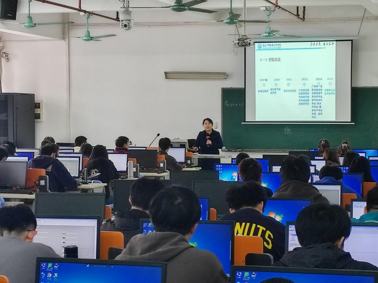 接着,她向同学们介绍了汽车工程学院的发展历史与取得的丰硕成果:学院成立于2008年,前身为电气自动化系。其中,新能源汽车技术专业为广东省一流高职院校高水平建设专业和广东省高职院校重点建设专业。同时,新能源汽车技术专业群是省级双高专业群,2023年的中期验收结果为“优秀”。学院曾获得中央财政支持建立实训基地。另外,我院学生最近在2023年第十八届“挑战杯”全国大学生课外学术科技作品竞赛中获得国家级二等奖。汽车工程学院历经十多年的发展,经过无数学生和教职工的共同努力,不仅取得了累累硕果,其规模也在不断壮大。