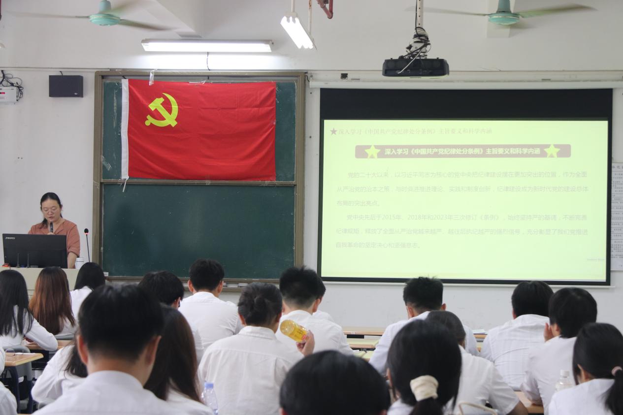 为进一步明确党员学生日常言行的衡量标尺,用党规党纪校正思想和行动,提高党员的党性修养,汽车工程学院学生党支部于6月21日下午在明德楼1-311开展《中国共产党纪律处分条例》专题党课学习,引导学生党员们学纪、知纪、明纪、守纪。本次会议由支部书记刘彩云主持,汽车工程学院党总支书记彭卫东、汽车工程学院辅导员以及支部全体正式党员和预备党员参加本次会议。