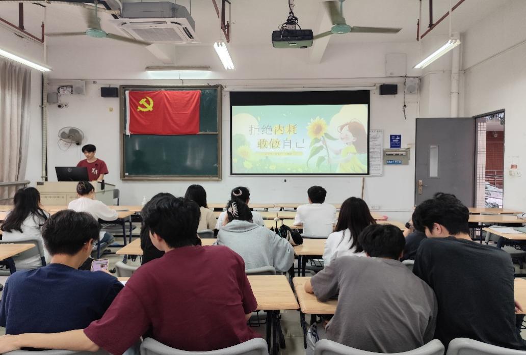 随后,宣传部陈博洲同志向大家分享“拒绝内耗,敢做自己”,告诉我们要学会调节自己的心态,积极乐观的心态去应对困难避免过多的内心戏活动,多阅读心理成长类书籍,拒绝内耗,做更好的自己。