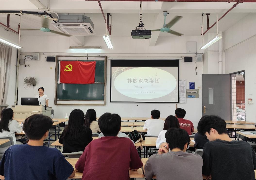 接着,志愿者部陈梦童同志为大家介绍《韩熙载夜宴图》这幅画作,通过作者顾闳中的生平简介、画作的创作背景、画卷内容及文化内涵等几方面进行分析讲解,让我们对这幅画作有更深层次的理解,领略到了古代艺术的魅力,激发了我们对美的追求和创造力的发挥。