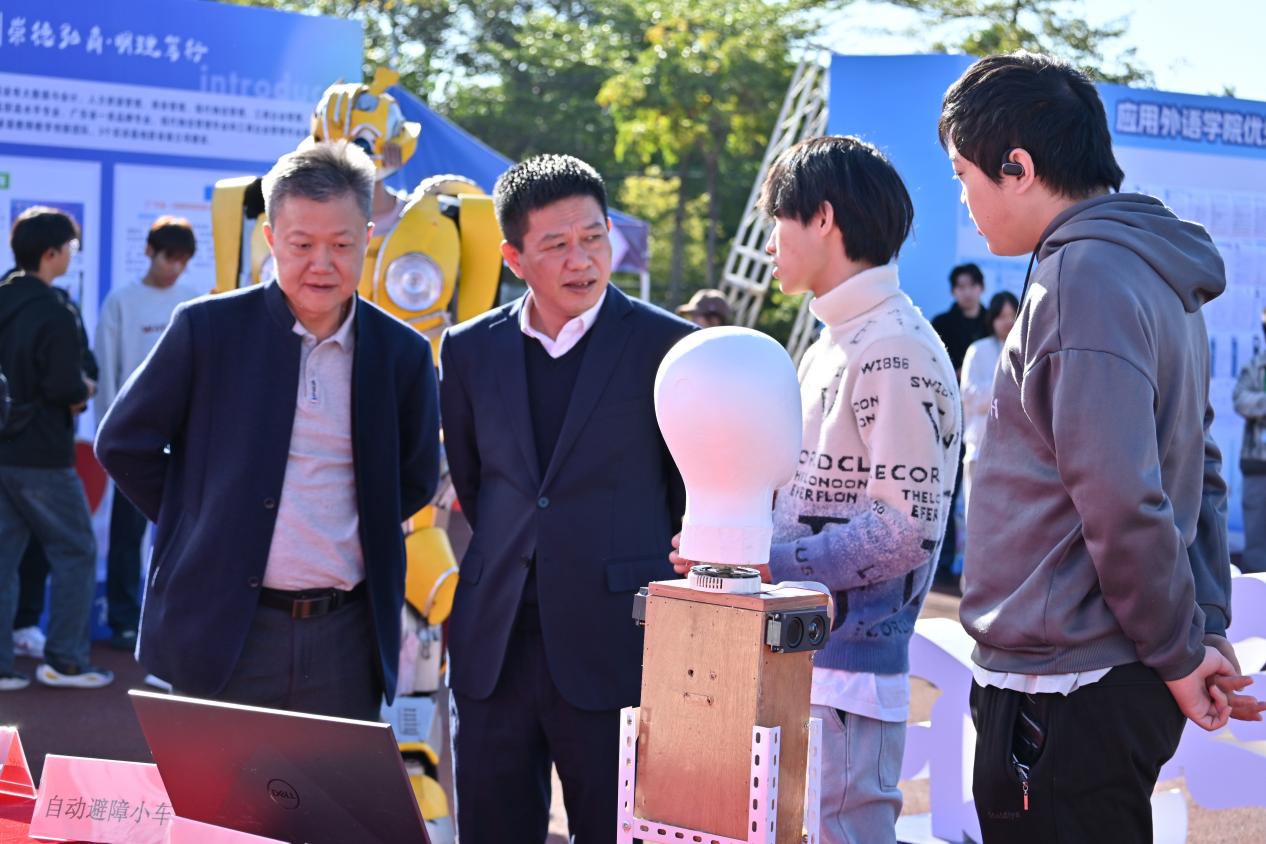 学校领导高度重视此次校园招聘会,学校党委书记何汉武,学校党委委员、副校长唐毓秋分别来到汽车工程学院的展位前,了解学院近年来的教学成果,并观看成果展示区的多款智能设备演示,包括教学机器人、非接触智能垃圾桶、自动避障小车、超远程取快递小车等。这些智能设备在学生们的操控下,或快速穿梭,或灵活避开障碍,或精准完成预设任务,无不展现出高度的智能化与稳定性,彰显出师生们的奇思妙想与精湛技艺。领导们仔细端详着智能设备的构造细节,主动向学生询问运行原理,对学生们的创新能力与实践水平给予了充分肯定,同时也鼓励学生们在未来的职业道路上要勇于探索、大胆创新。