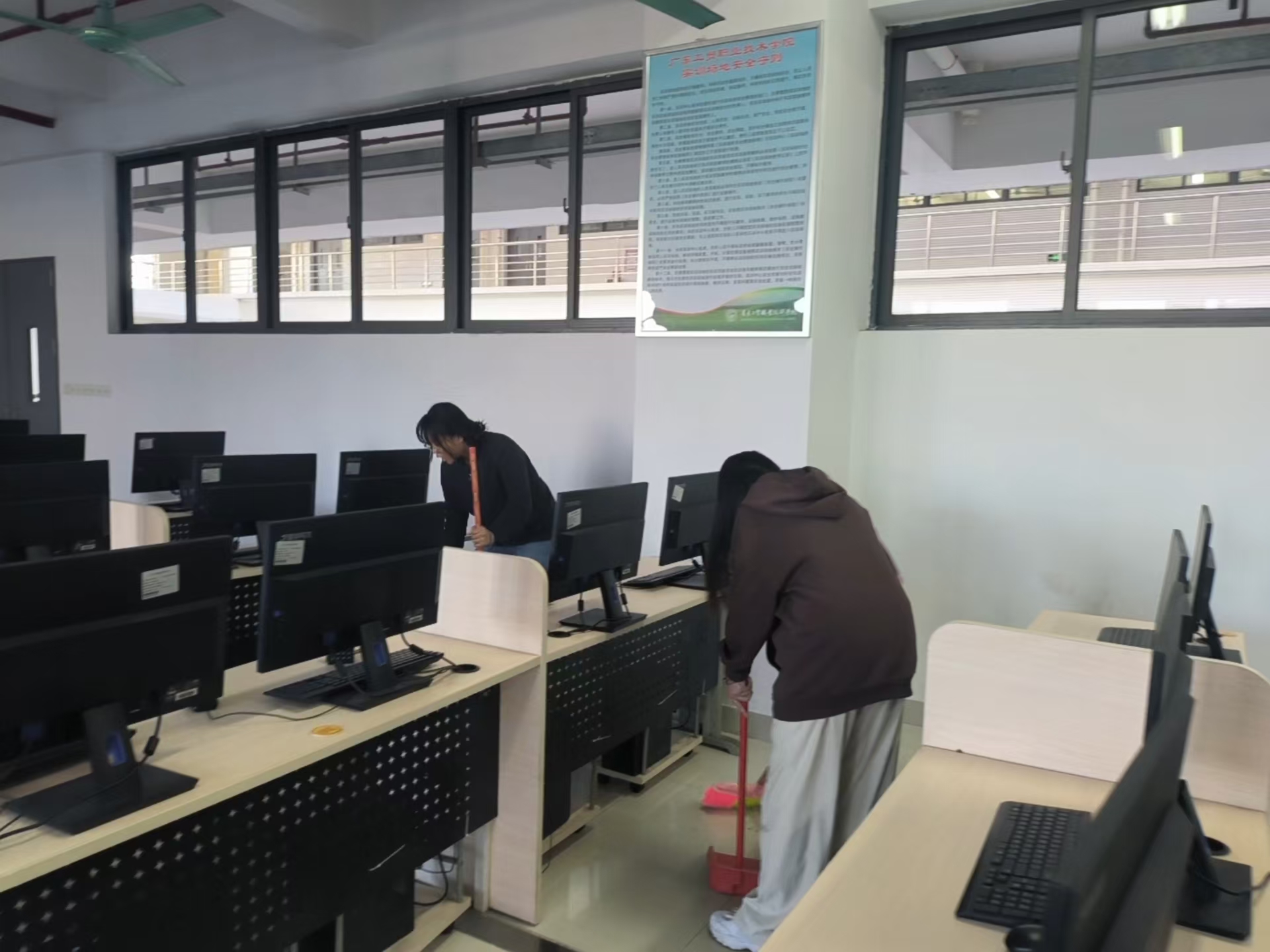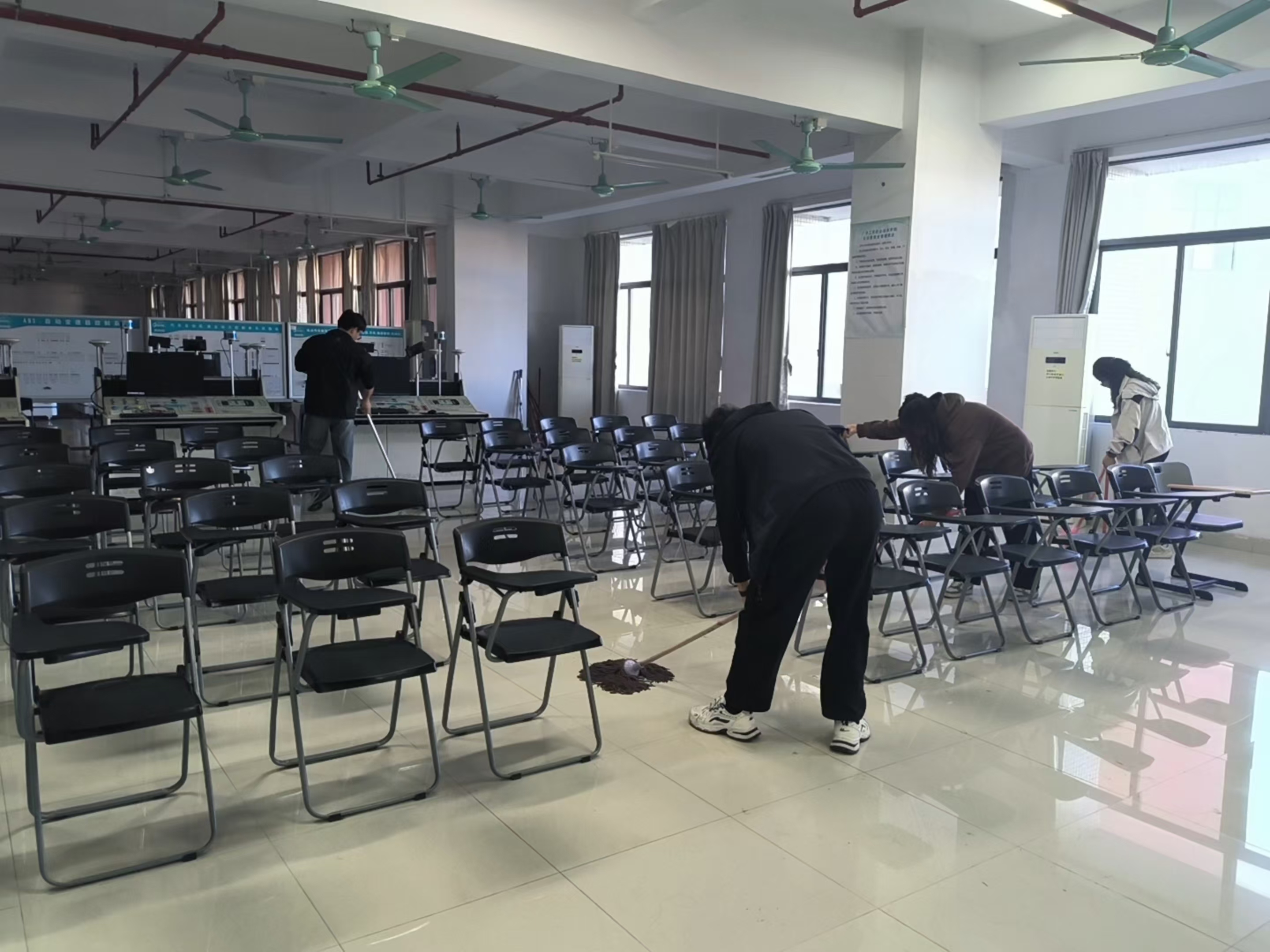 实践活动现场 发展对象们践行“全心全意为人民服务”的宗旨,将学到的理论知识运用于实践之中。在支部党员同志的带领下,实践活动顺利开展,发展对象们自带清洁工具,听从安排、分工合作、有条不紊地打扫教室的每个角落。在整个实践活动中,培训班的学员们表现积极,以身作则,充分体现了团结合作、乐于奉献的精神。这次社会实践活动进一步美化了校园环境,为同学们营造出整洁文明、干净美丽的学习环境。