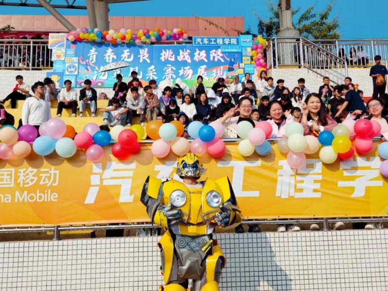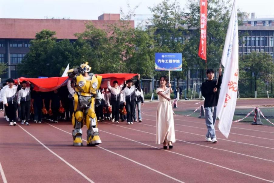 “他们如同机械战士,英勇无畏,蓄势待发。他们以汽车为梦,以科技为翼,不断追求卓越与创新……”伴随着激情洋溢的解说词,汽车工程学院的方阵迈着整齐有力的步伐入场。同学们身着统一服装,手举旗帜、挥舞彩球,奋力喊出学院的口号:“青春无畏,挑战极限;汽车风采,赛场展现!”前方炫酷的大黄蜂,身姿矫健,英气逼人,展现着汽车人的风采与力量,充分体现了汽车工程学院的专业特色和青春活力,赢得了在场观众的阵阵喝彩。