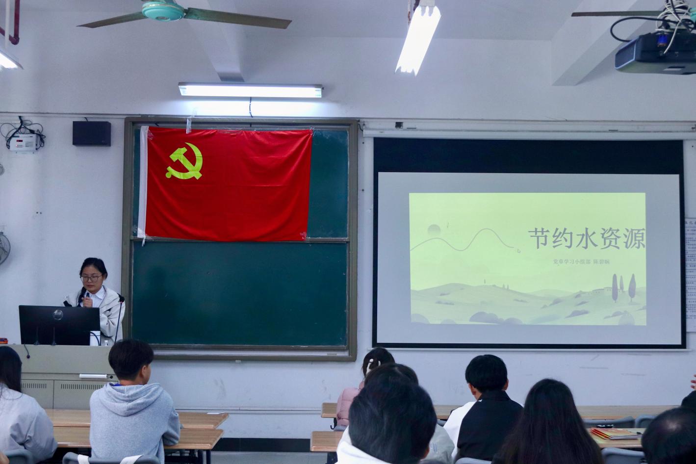 随后,党章学习小组陈碧娴为大家讲解“节约水资源”。她从五个方面出发,生动详细地讲解了水资源的现状与挑战。我们要从身边小事做起,减少一次性用品的使用,合理分类垃圾。水是生命之源,这让我们意识到节约用水不仅仅是一个口号,更要从点滴做起,将所学知识运用到实践之中去。
