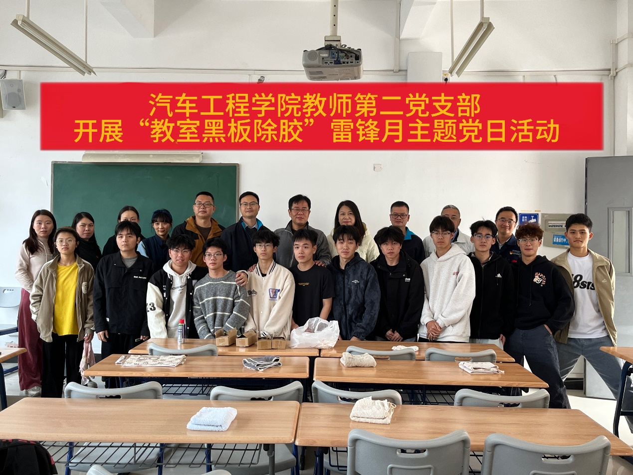 为深入学习贯彻落实党的二十大精神和二十届三中全会精神,学习贯彻习近平总书记关于弘扬雷锋精神的重要论述,增强党员同志对雷锋精神的理解与认同,营造良好的校园文化氛围。汽车工程学院教师第二党支部全体党员于2025年3月18日在明德楼开展“教室黑板除胶”雷锋月主题党日活动。汽车工程学院党总支副书记欧敏和党总支组织委员王锋参加活动。