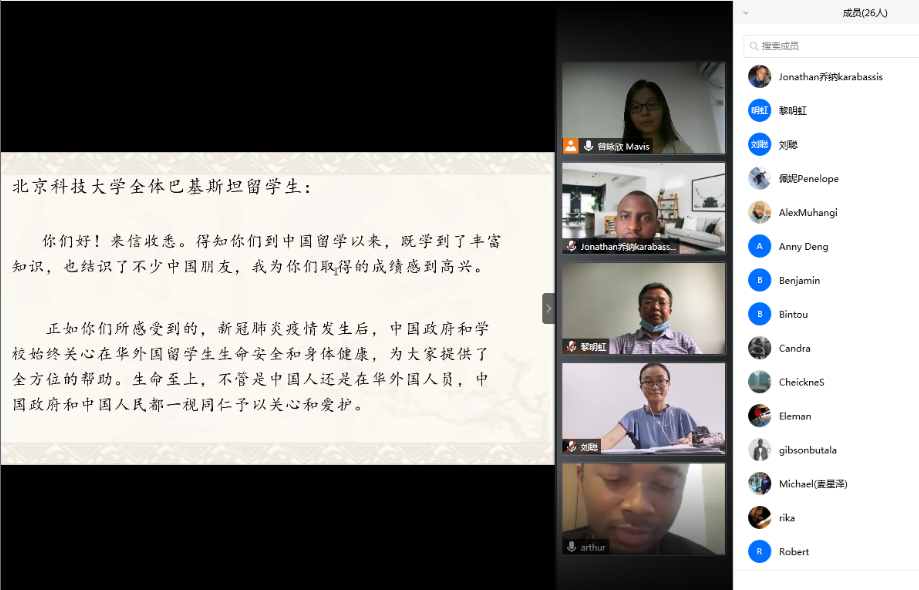 视频座谈会上,赞比亚留学生麦星泽、赞比亚留学生潘妮、尼日利亚留学生Arthur、马里留学生Simpara等也纷纷谈了他们的体会,感谢中国政府和学校在这段困难时期对在华留学生真切的关怀,表示理解与支持中国的抗疫政策,表达了愿为构建人类命运共同体发光发热的决心。