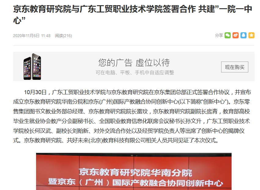 10月30日,我校在北京京东集团总部进行合作签约以及成立京东教育研究院华南分院和京东(广州)国际产教融合协同创新中心的揭牌仪式。此次京东集团与我校在广州共建“一院一中心”。“一院一中心”是京东集团教育板块在全国布局的五个分院之一和五个中心之一,结合我校的优质科研实力以及粤港澳大湾区经济和产业基础,双方将引入京东集团人工智能、大数据、无界零售、跨境电商等方面的人力与技术优势资源,实施产教对接对话,在职业教育产教融合、技术应用等方面进行创新性研究,在标准引领、教材研发、技术研发、赛项研究、技术服务、课题研究等领域产生一批有影响力的成果,打造电商、跨境电商、人工智能、大数据、云计算等行业引领的复合型国际化人才培养新高地,也标志着学校和世界500强企业的深度合作与融合,为实现职业教育领域的换道超车,共同打造华南地区电子商务、跨境电商及人工智能等职业教育新高地,培育和建设国家级产教融合试点工程和面向华南地区开展产教融合、校企合作的示范性载体,为职业教育发展贡献广东工贸-京东标准和中国方案。