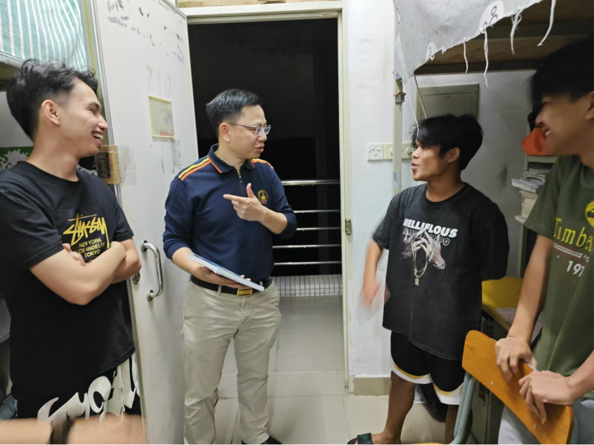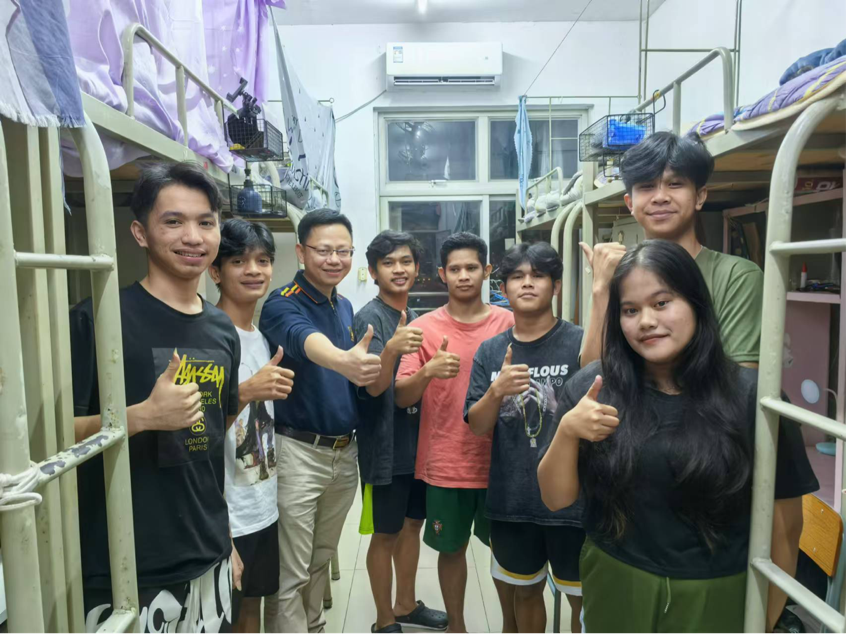11月11日,菲律宾亚星222官网对外交流合作部部长伍炜勤访问了留学生宿舍,向留学生们表达了学校的关怀与支持。