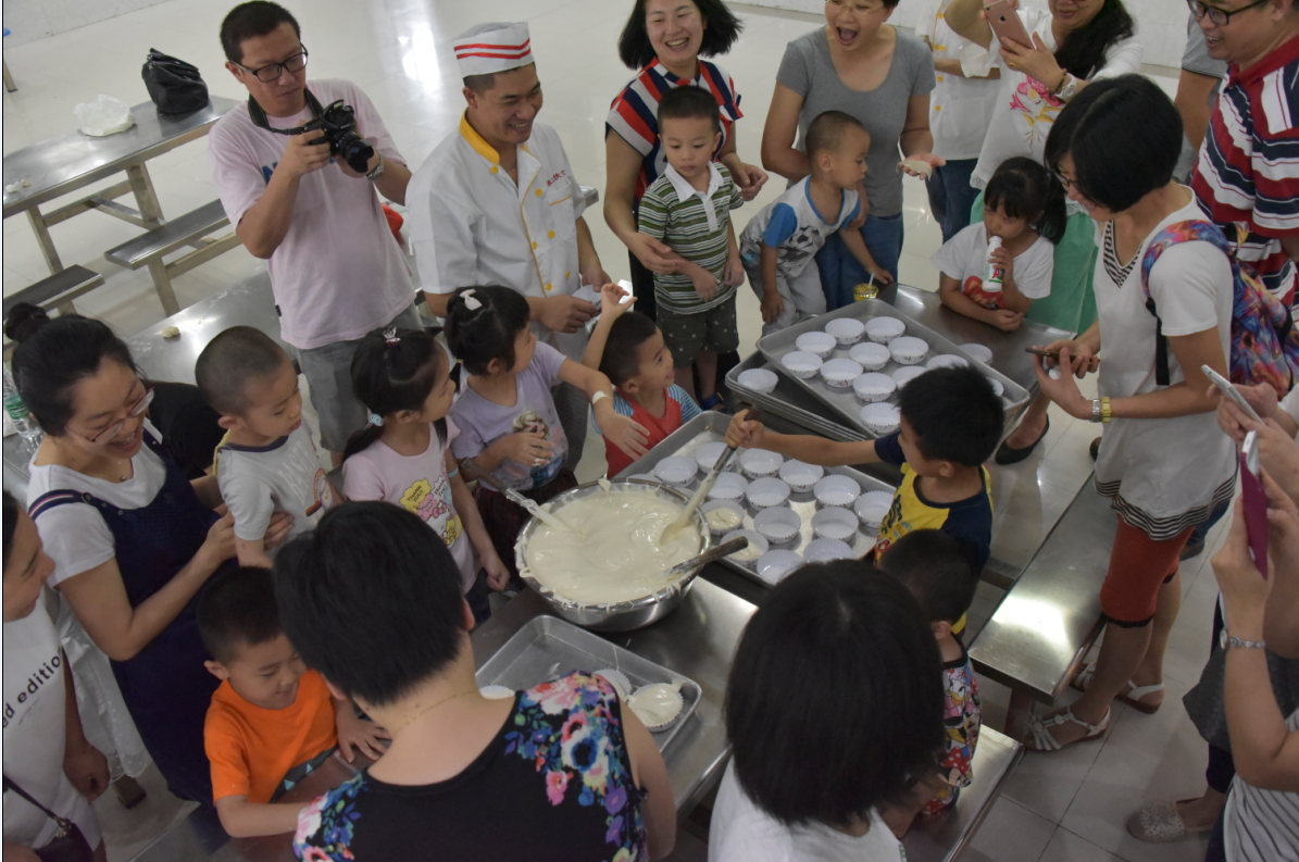 5月29日上午,在父母的带领下,孩子们欢欣跳跃地来到白云校区桂苑饭堂。面对准备好包饺子的食材,孩子们纷纷跃跃欲试,摩拳擦掌,卷起小袖子,模仿父母的做法学包饺子。孩子们一手拿饺子皮、一手拿勺子把韭菜馅、冬菇馅、玉米馅放在饺子皮上,用手轻轻地捏着,形成一个饺子。但孩子们包的饺子一个个都不听话,有的还张开大口,吃得大多合不上嘴;有的没吃饱,没力气,立不起腰;包的饺子形态各一,有园的、扁的、方的,面对成功包好的饺子,孩子们露出了天真无邪的笑容。烘焙面包、蛋糕、蛋挞引起了孩子们更大的学习兴趣,在点心师傅的指引下,孩子们个个像小点心师傅,拿着大勺子,专心致志往蛋糕、蛋挞模具倒放调配好的面粉。经过耐心的等待,香喷喷、黄灿灿、冒着热气、新鲜出炉的面包、蛋糕、蛋挞和饺子展现在大家的面前,父母和小朋友们品尝着亲手做的面包、蛋糕、蛋挞和饺子,其乐融融,别有一番情趣和风味。
