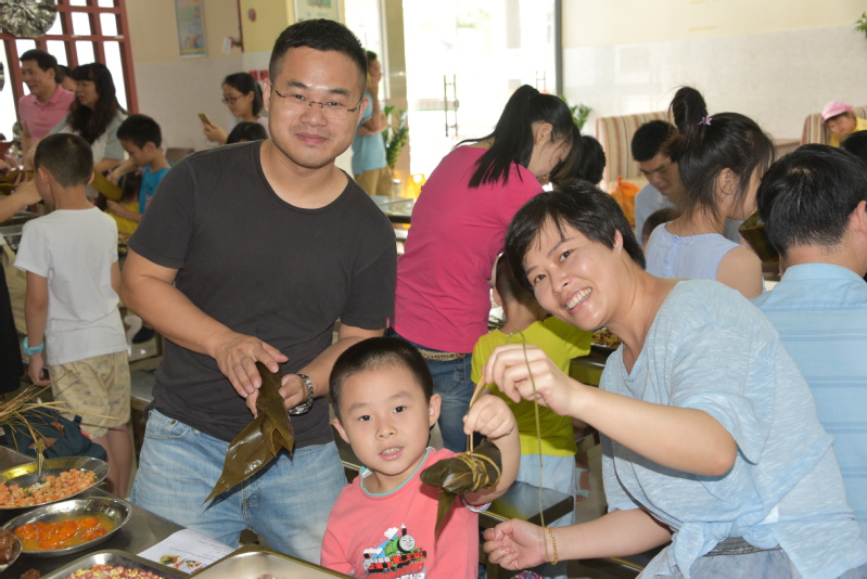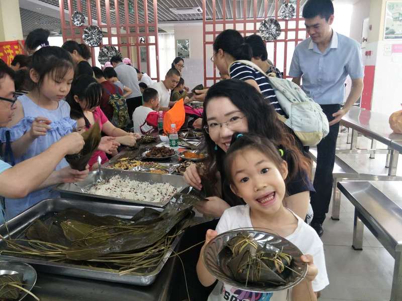 工会为这次DIY包粽子亲子活动准备了所需要的材料,购买了粽叶、糯米、五花肉、调料等,为整个活动做好准备。6月2日上午,孩子们在父母的带领下欢欣跳跃地来到白云校区桂苑饭堂,面对准备好包粽子的食材,家长们边包边耐心地向孩子们讲授包粽子的方法,孩子们纷纷跃跃欲试,摩拳擦掌、“现学现卖”,用一双小手,把粽叶挽成漏斗状,放进糯米,放进五花肉等食材,然后用粽叶把米包住,用小手指按住绳子的一头,一缠一系,把粽子包好;现场还进行了端午节知识抢答和才艺表演,整个活动其乐融融。