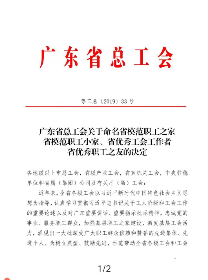 日前,广东省总工会下发《广东省总工会关于命名省模范职工之家、省模范职工小家、省优秀工会工作者、省优秀职工之友的决定》(粤工总〔2019〕33 号),学校工会命名“省模范职工之家”称号。此次命名“省模范职工之家”在广东省教科文卫工会系统只有5个单位,其中三个单位为本科学校的附属医院,二个单位为高职院校。