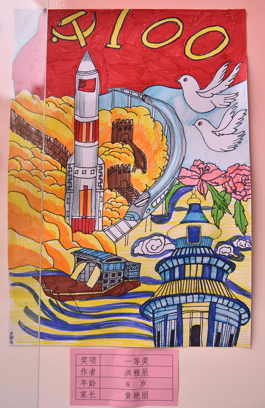 童真是孩子的本性,每一幅作品都是孩子们用快乐的童心绘就,都是孩子们情感的童真流露,让我们看到了一个稚拙的、一尘不染的童真世界。孩子们用简洁的线条、绚丽的色彩,画出一颗童心永向党,红色基因代代传的精神,表达出对党、对祖国的热爱。