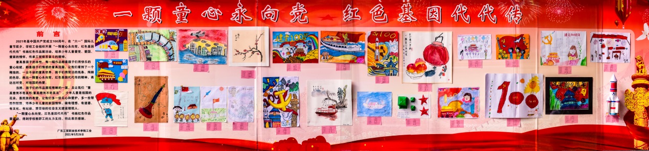 为营造庆祝中国共产党成立100周年的浓厚氛围,让红色基因滋润少年儿童茁壮成长,培养少年儿童的家国情怀,做有理想、有道德、有文化、有纪律、爱劳动的社会主义建设接班人,在“六一”国际儿童节前夕,学校工会举办“一颗童心永向党,红色基因代代传” 书画红色作品展。