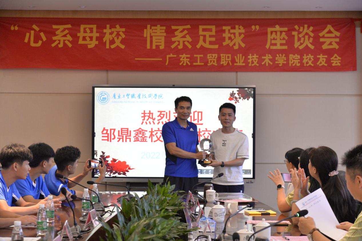 座谈会上,邹鼎鑫校友向学校足球队赠送了纪念品,黄雄志代表学校向邹鼎鑫校友回赠了纪念品。