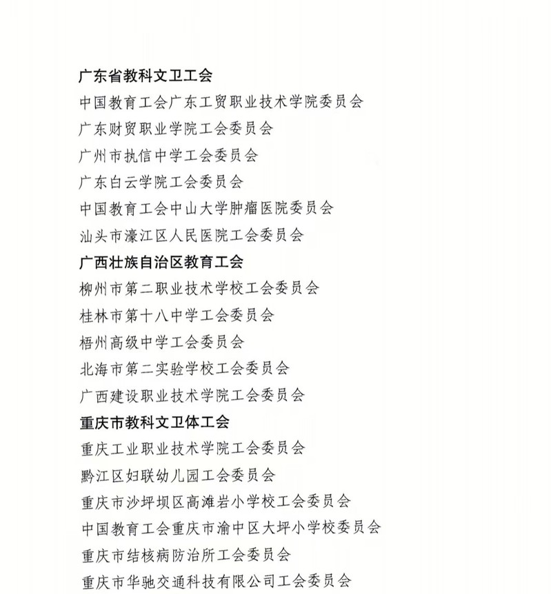日前,中国教科文卫体工会全国委员会印发《关于确认全国教科文卫体系统模范职工之家,模范职工小家的通知》(教科文卫体工发 [2023] 14号)文件,中国教科文卫体工会决定选树中国教育工会北京外国语大学委员会等180个单位为全国教科文卫体系统模范职工之家,选树清华大学电子工程系工会等181个单位为全国教科文卫体系统模范职工小家,学校工会选树为全国教科文卫体系统模范职工之家。此次在广东省教科文卫工会系统选树为“全国教科文卫体系统模范职工之家”共有6个单位,其中二个为医院系统,二个为高职院校,一个为私立本科学校,一个为高中学校。