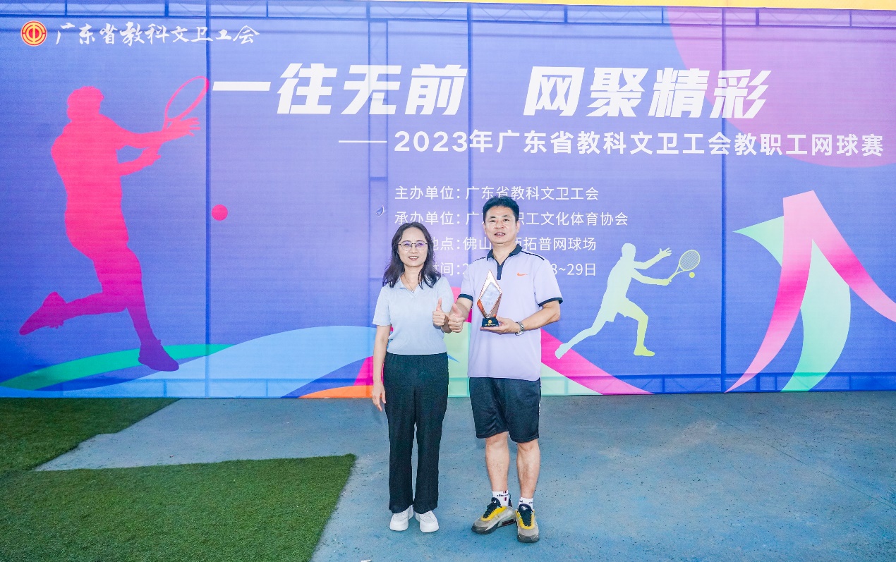 为深入开展全民健身活动,全面增强职工体质,加强各校之间的学习交流,广东省教科文卫工会于1028日—29日在佛山大沥拓普体育馆举办第二届广东省教科文卫工会教职工网球比赛。教职工网球队由学校工会主席陈珊兴为领队,组织12名教职工运动员参加网球团体比赛,获高职高专组排名第三名,陈珊兴获“主席杯”第五名。