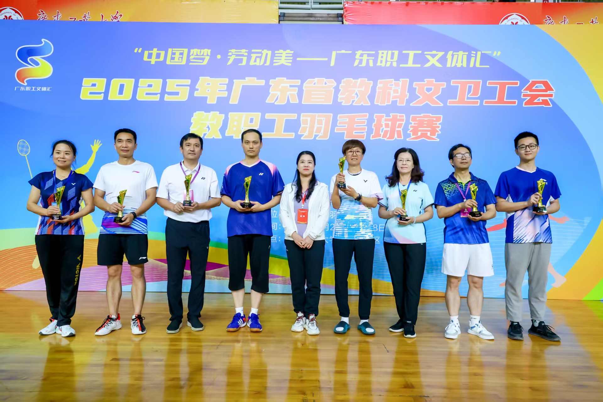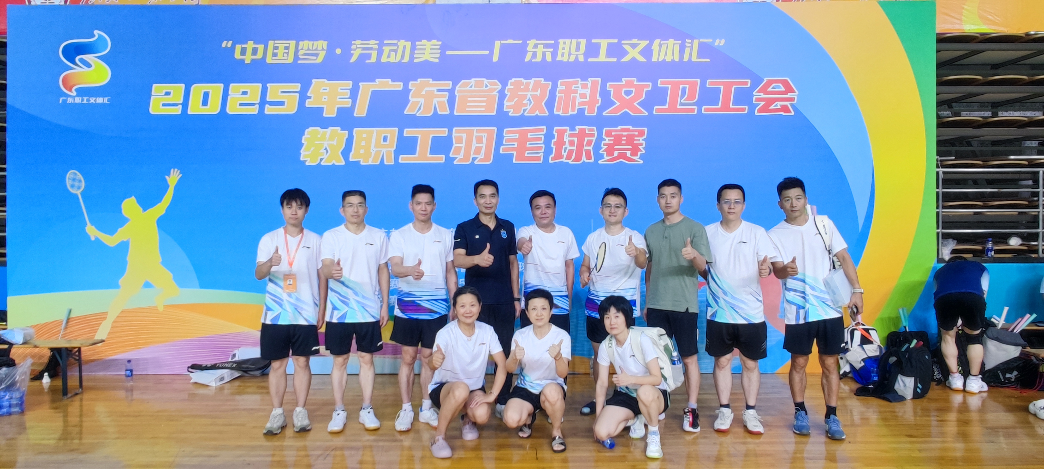 524-25日,2025年广东省教科文卫工会教职工羽毛球比赛在广东工业大学大学城校区体育馆举行,本次比赛共有本科1、本科2、高职中学、高职中专、附属医院5个片区共71所单位报名参赛,其中高职中专片区共16所高校。在教职工羽毛球协会的积极组织与协同努力下,经过两天紧张激烈的比赛,我校教职工羽毛球队最终以高职中专片区第六名的成绩载誉而归。
