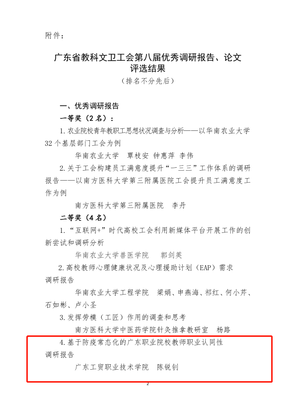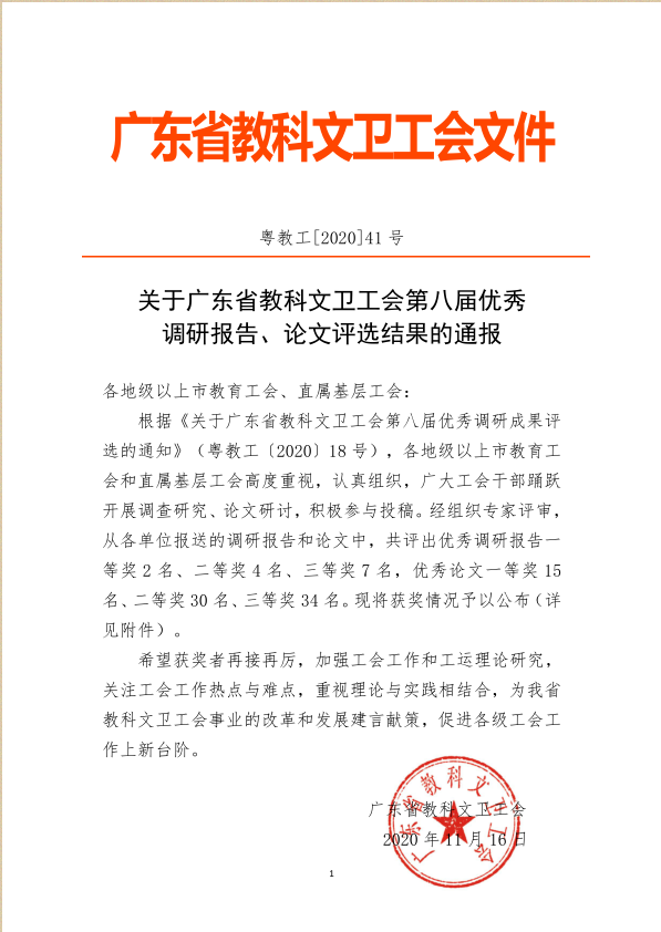 2020年是特殊而不平凡的一年,在突如期来的新冠疫情影响下,学校工会根据《关于广东省教科文卫工会第八届优秀调研成果评选的通知》精神,发动教职工结合疫情防控和工作实际,积极开展调查研究;教职工克服各种困难,撰写论文或调研报告,勇跃向学校工会投稿。经过学校工会认真审核和筛选,共推荐四篇较高质量的论文或调研报告参与广东省教科文卫工会第八届优秀调研成果评选,取得了四个二等奖的可喜成绩。