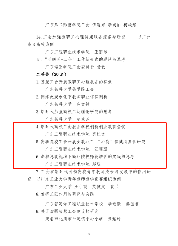 近日,广东省教科文卫工会公布了《关于广东省教科文卫工会第八届优秀调研报告、论文评选结果的通报》,我校教职工获得多项奖项。陈锐钊老师的《基于防疫常态化的广东职业院校教师职业认同性调研报告》获得优秀调研报告二等奖;蔡桂文老师的《新时代高校工会服务学校创新创业教育刍议》、汪珊珊老师的《高职院校工会开展女教职工 “心商”保健必要性研究》、赵聪老师的《课程思政视域下高职院校师德培训的实践与思考》获得优秀论文二等奖。