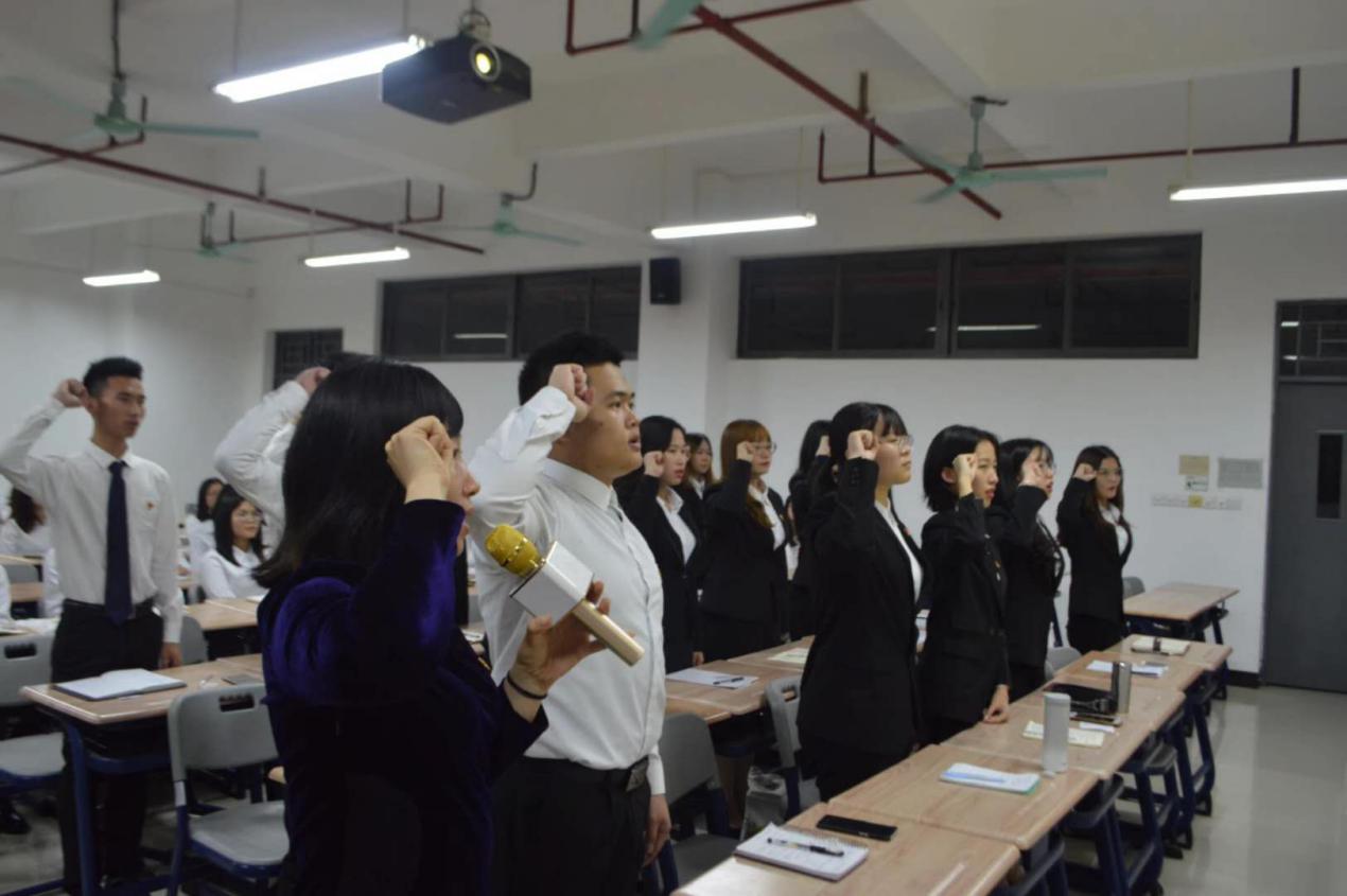课程中,周清莲通过图文结合将固态化表达的理论话语转化为时代的现实话语来回应在场的同学,用真理的强大力量引导同学们反思:什么是理想?理想是什么? 1917年,周恩来写下“愿我们相会于中华腾飞世界之时”。2019年,我们将以什么姿态乘上中华这条即将腾飞、遨游四海的巨龙?周清莲指出,面对未来的波涛汹涌,大家应坚定“四个自信”,坚定理想信念,在各自的领域上顽强拼搏,立志肩负起民族复兴的时代重任。最后,周书记引领现场18名预备党员重温入党誓词,并为其颁发党徽。
