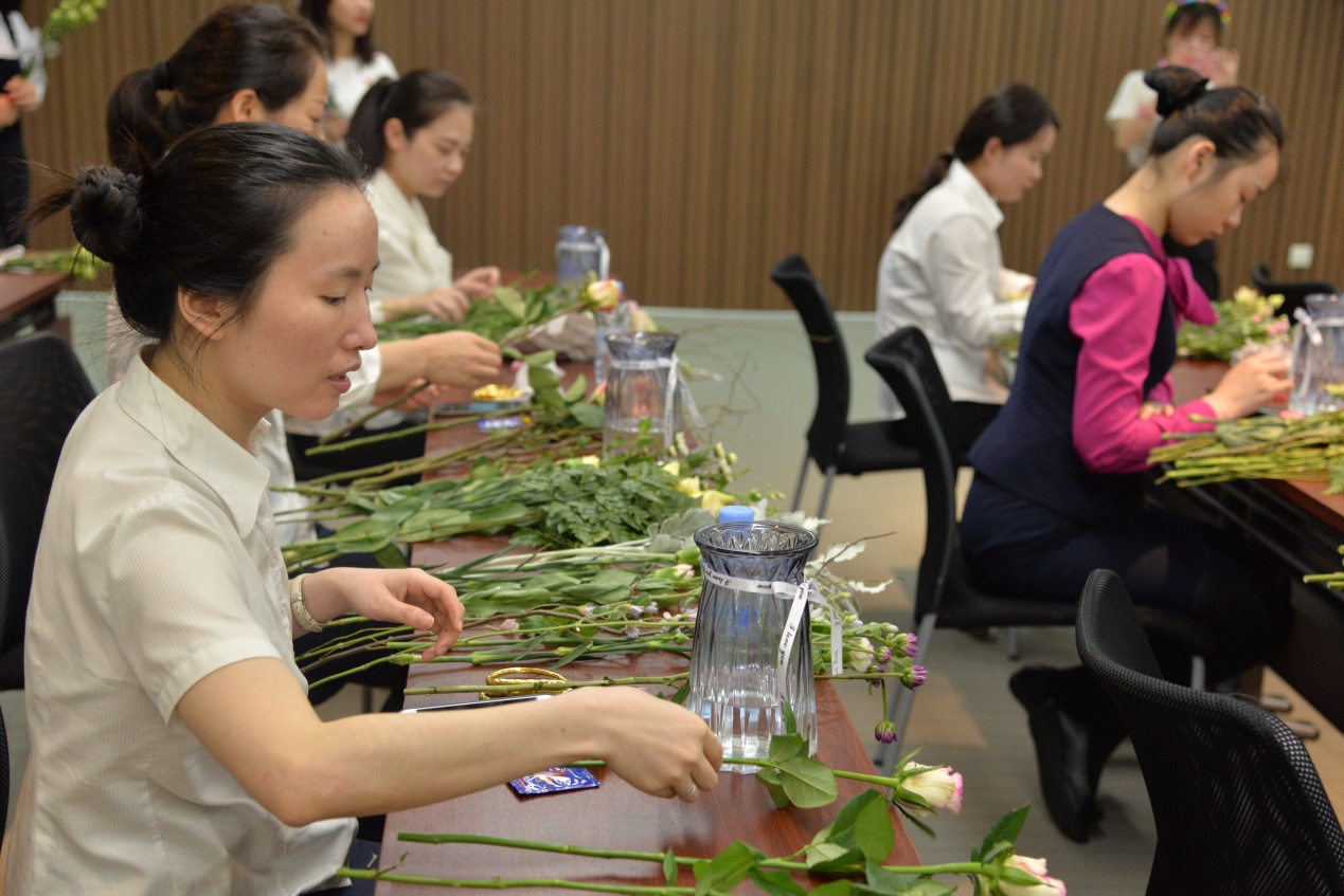 插花,不仅可以美化居住环境,为家庭生活增添美感和温馨,也是探新访友、迎送宾客最高雅、最珍贵的礼品。学会插花,可以与花作伴,以花为友,滋养心灵,陶冶情操,表达情感。2019年5月30日,工商管理学院倪春丽副院长带领李爽老师以及四位学生助教组成社会服务团队,为广东美居物业管理公司提供花艺雅修社会服务。