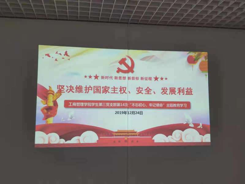 工商管理学院学生第三党支部于20191224日下午开展第十四次“不忘初心、牢记使命”主题教育学习。加强学生党员爱国主义教育,弘扬爱国主义精神,增强维护国家主权意识、向身边的先进典型学习。