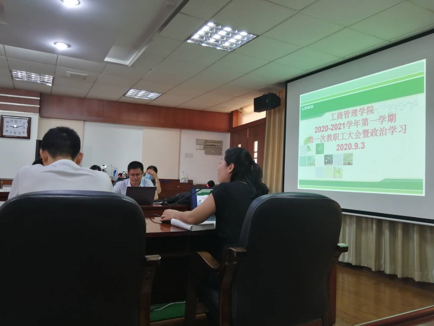 为全力保障新学期开学各项工作安全有序进行,9月3日上午,工商管理学院在天河校区西区三楼中心会议室召开了2020-2021学年第一学期第一次教职工大会暨政治学习会议。