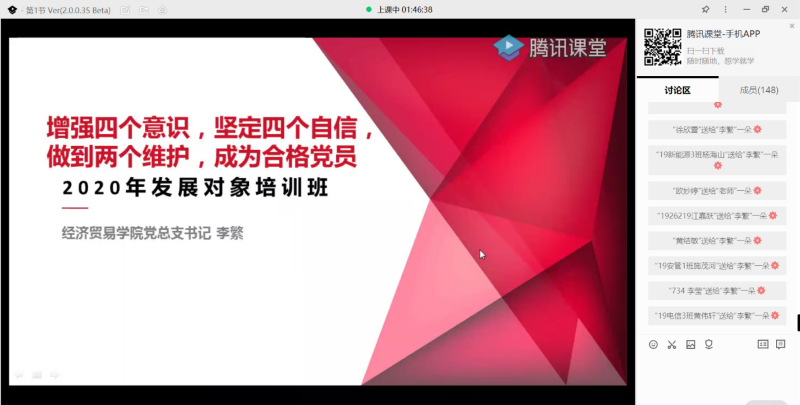 意识引领行动,思想决定出路。为深入贯彻习近平新时代中国特色社会主义思想,使发展对象进一步端正入党动机,20201151900,经济贸易学院党总支书记李繁为2020年第二期发展对象培训班学员开展主题为“增强四个意识,坚定四个自信,做到“两个维护”成为合格党员”的线上专题培训。