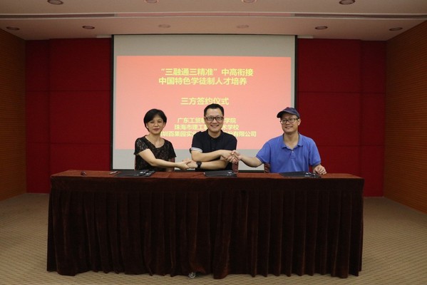 5月20日上午,我校与珠海市理工职业技术学校、深圳百果园实业(集团)有限公司在百果园广州分公司会议室举行“三融通三精准”中高衔接中国特色学徒制人才培养校企三方合作签约仪式。工商管理学院党总支书记周清莲、院长邹德军、副书记谢宏祥、副院长倪春丽等以及珠海理工职业技术学校张伟铭校长一行,深圳百果园实业(集团)股份有限公司粤西区域总经理刘飞、广州区人力资源高级经理李进凑等参加了仪式。