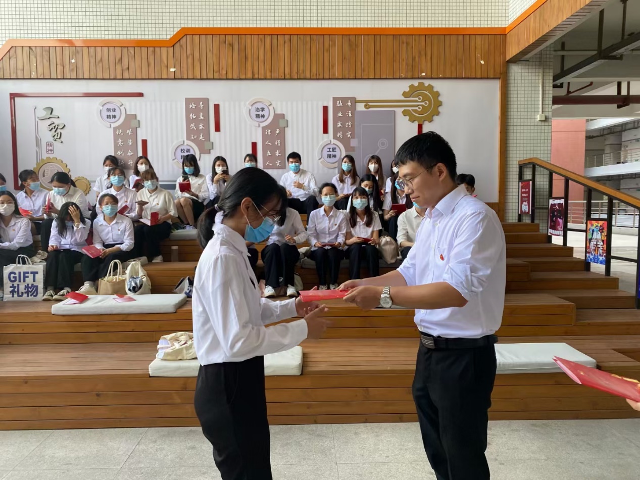 工商管理学院学生第一党支部书记谢简为党员颁发贺卡