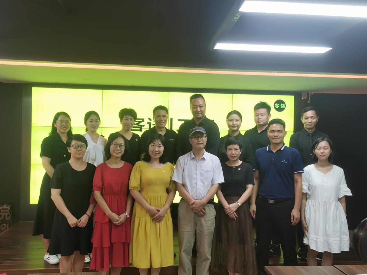 2021年7月8日,工商管理学院第二批现代学徒制试点商务管理专业团队在广东客语餐饮有限公司隆重举行客语“现代学徒制”教学推进会暨导师互聘和实践基地授牌仪式。学院党总支书记周清莲、院长邹德军、党总支副书记谢宏祥、副院长倪春丽、商业服务系主任何美贤、办公室主任王家祺,广东客语总经理陈景新、副总经理曾开源、人资总监王燎原、营运助理兼教学秘书陈秋洁等参加了此次会议。