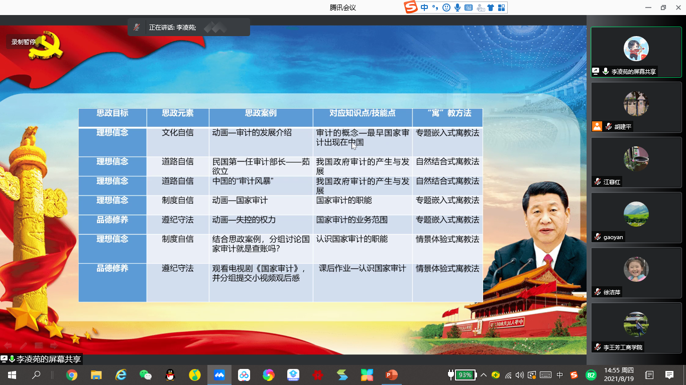 8月19日下午,工商管理学院财税服务系召开了以“推进党史学习教育,融入课程思政”为主题的线上集体备课会,全体教师参加。会议主持人、财税服务系系主任胡建平表示,教师应坚持将“立德树人”与“铸魂育人”有机结合,以党史学习教育作为立德树人的重要抓手,理直气壮地讲政治、讲党史,把党史学习教育融入课程思政建设中,用好红色资源,丰富课程内容,不断深化课程思政教学改革,擦亮中国特色社会主义学校的鲜亮底色。