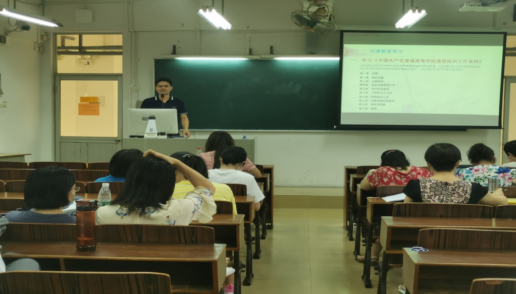 为深入学习贯彻习近平总书记“七一”重要讲话精神和习近平新时代中国特色社会主义思想,推动全面从严治党,2021年9月28日下午,工商管理学院党总支在天河校区西区综合楼405开展纪律教育专题学习活动,由学院党总支书记周清莲主持,全体教师党员参加。