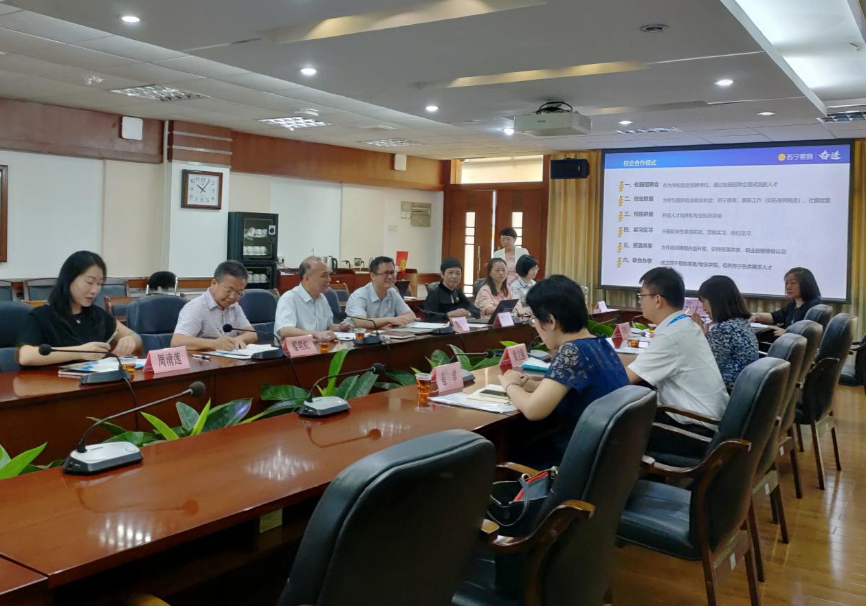 夏韩辉提出,加强学校与苏宁易购校企双方的紧密合作,对提升产教融合深度和广度,实现校企双赢具有重要意义,希望工商管理学院与苏宁易购后续的合作交流中加快具体项目的落地建设与实施。黎明虹处长表示,对外交流合作处将积极推进苏宁-工贸通过校企共建产业学院和实训基地等方式,持续不断促进职业教育和产业发展的深度融合,推进职业教育以更加开放的姿态融合区域产业发展,加快职业教育办学机制改革,促进优质资源开放共享。